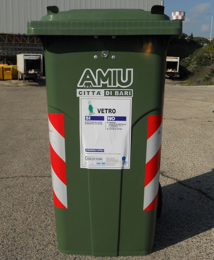 I bidoni verdi sono dotati di coperchio con oblò munito di protezione in gomma antischeggia. Le bottiglie potranno essere introdotte soltanto singolarmente al fine di evitare che all’interno dei bidoni vengano depositati sacchetti con rifiuti di ogni genere.