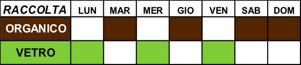 La raccolta dell’organico e del vetro verrà effettuata, a partire da lunedì 18 p.v., dalle ore 23:30 alle ore 03:30.  I bidoncini dell’organico e del vetro si dovranno esporre fuori dalla propria attività dalle 08:00 alle ore 23:30 con il seguente calendario di servizio: