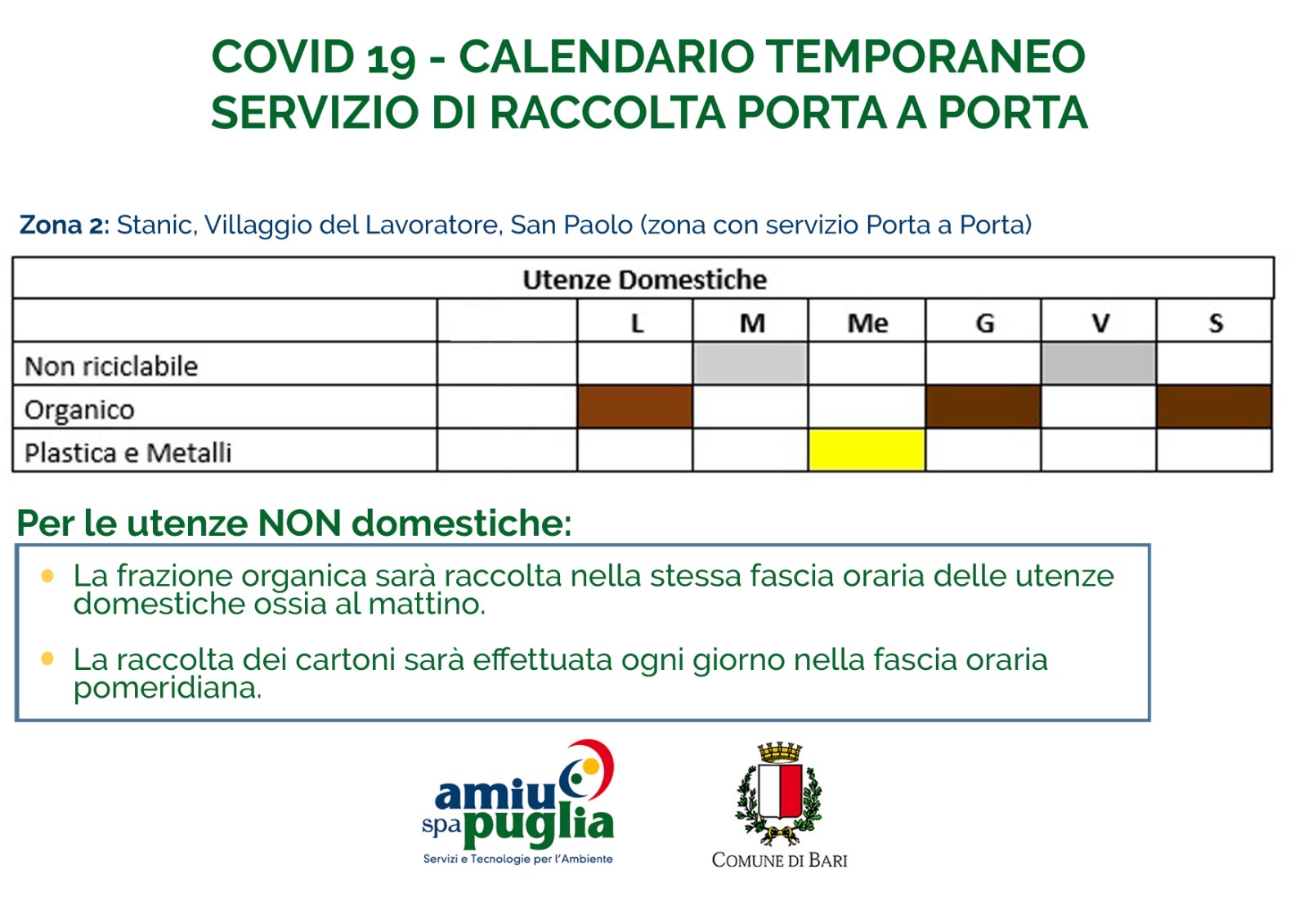 Per le utenze NON DOMESTICHE, presenti in queste zone, si osserverà questo stesso calendario: la frazione organica sarà ritirata al mattino nello stesso passaggio previsto per le utenze domestiche, la raccolta della plastica si effettuerà un giorno a settimana, mentre potranno conferire i cartoni negli orari pomeridiani nelle modalità consuete.