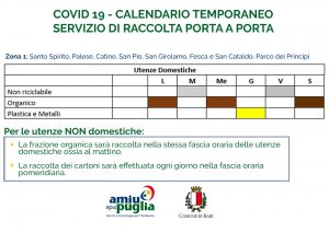 Nella ZONA 1 (Santo Spirito, Palese, San Pio, San Girolamo, Fesca, San Cataldo, Parco dei Principi) restano confermati 3 ritiri per l’organico, 2 ritiri per la frazione non differenziabile e il giovedì saranno ritirate le frazioni di plastica e metalli, come UNICA giornata invece di due. Al momento è sospeso per tutti (utenze domestiche e non) il ritiro delle frazioni carta e vetro fino a termine dell’emergenza.